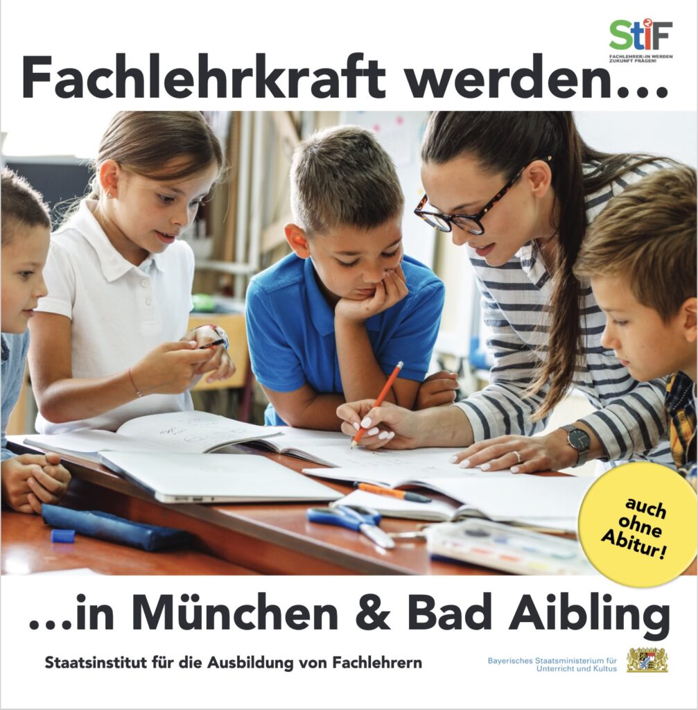 Sie möchten als Fachlehrkraft an bayerischen Schulen arbeiten? Sie suchen nach einem Ausbildungsweg ohne Abitur als Zulassungsvoraussetzung? Dann finden Sie Ihren Traumberuf bei uns!