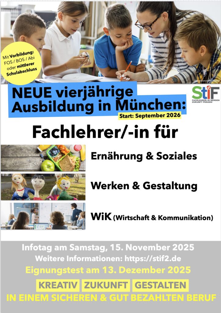 wir freuen uns, Ihnen mitteilen zu können, dass wir im Studienjahr 2026-2027 mit einem neuen Angebot in München am Start sind: Die vierjährige Ausbildung zur Fachlehrkraft für Ernährung, Gestaltung und Informationstechnik. Zulassung nach Eignungstest und ab mittlerem Schulabschluss.
